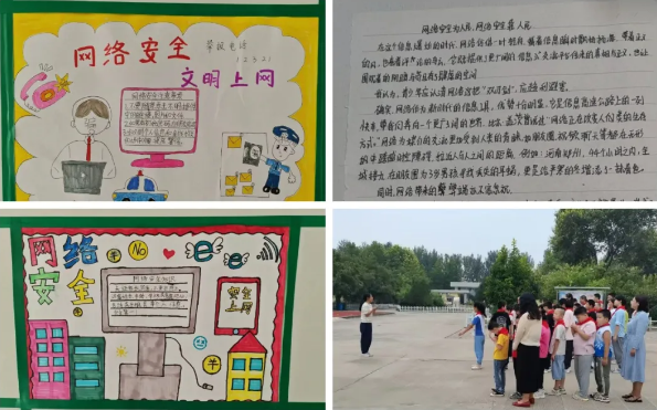 学生们通过绘制手抄报、开展国旗下讲话,进一步认识到网络是把“双刃剑”,在日常上网中注意防范病毒传播、网络诈骗、有害信息蔓延、个人信息泄漏、网络游戏成瘾等带来的危害。