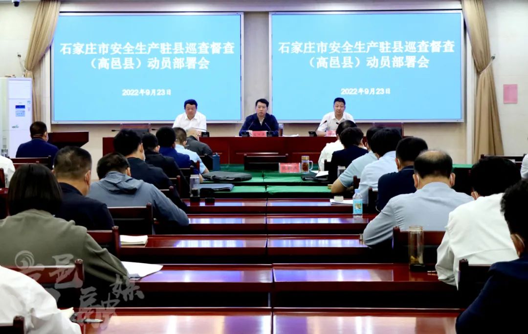 9月23日,石家庄市安全生产驻县巡查督查(高邑县)动员部署会召开。市第九巡查督查组领导张爱民、白建辉、赵国龙,县领导苗润涛、杨东国、米琳、李志强、张新杰出席会议。县直相关部门、各镇、社区办、企业负责人参加会议。