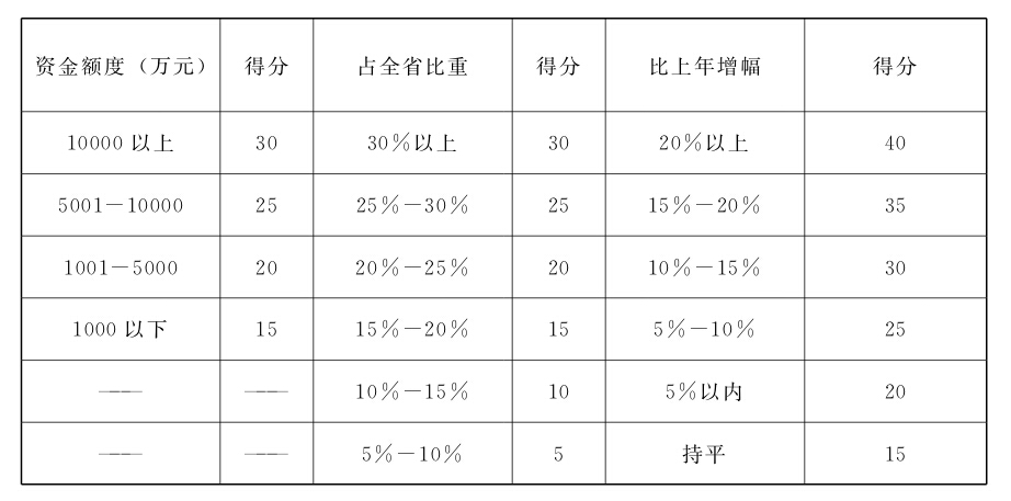 (三)年终考核排名。次年2月份,市争资办按照争资额度、全省占比和比上年增幅等因素得分排名,对各部门全年争资工作完成情况进行考核(评分标准见附表)。排名情况在全市通报,排名靠前的十个部门确定为“争资工作先进单位”,由市政府予以表彰,排名后五位的予以通报批评。