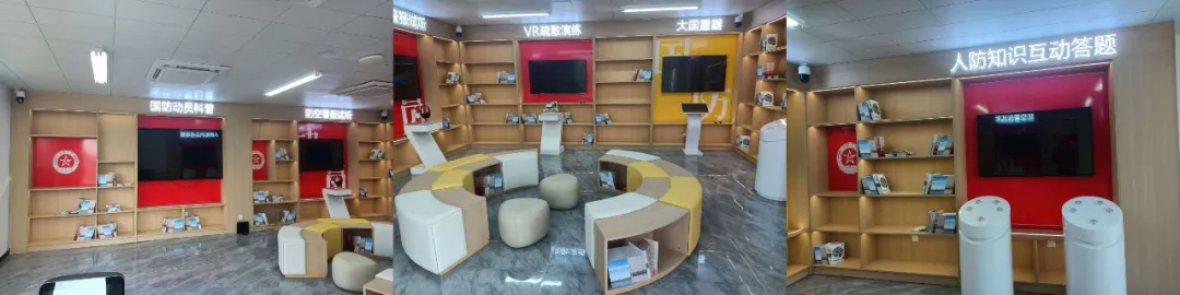 外部以红色为主色调,搭配国防动员口号及国防动员徽标,内部以科普宣传角和互动展示区为主题。科普宣传角错落有致地摆放了国防、国防动员、人民防空等相关宣传资料;互动展示区主要是防空警报试听、VR疏散演练、大国重器、国防动员知识互动答题及AI互动机器人五个模块。