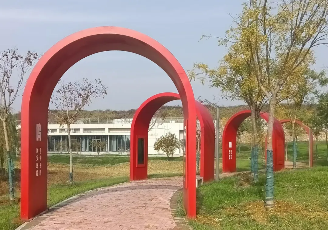 鹿泉区国防动员宣教基地的标志。其中,白色立柱表面嵌入国防动员的宣传标语;红色立柱上方采用长城的造型元素,寓意筑牢坚不可摧的地下长城。红色立柱表面采用镂空雕刻形式,选取国防动员的核心内容进行刻画,造型生动传神,将国防动员知识与雕塑设计融为一体。