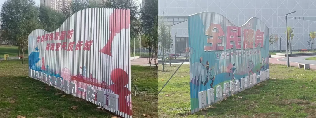 以国防动员与全民健身为主题。从南面看,画面内容是国防动员宣传标语,从北面看,画面内容是全民健身主题,这样的设计方式,生动诠释了国防动员与全民健身的密不可分,深刻表达出宣教基地的中心思想,突出主题、彰显和谐,有效传播国防动员的思想和精神。