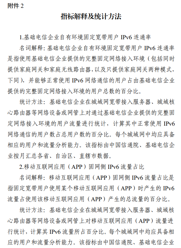 ——基础设施能力持续增强。骨干网、城域网、5G等基础网络基于IPv6进一步升级演进;在企业组网和上云等场景中,新增用户开通的IP专线业务50%以上采用分段路由等创新技术;新增网络基础设施和应用基础设施规模部署IPv6单栈;不再新增部署面向互联网用户的IPv4到IPv4网络地址转换(NAT)设备,加快存量设备退网;打造超过1000个支持“IPv6+”技术能力的承载网络、企业/园区网络和数据中心。