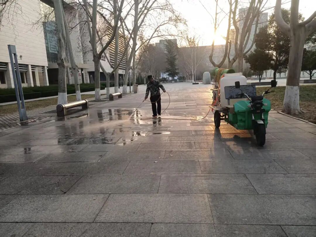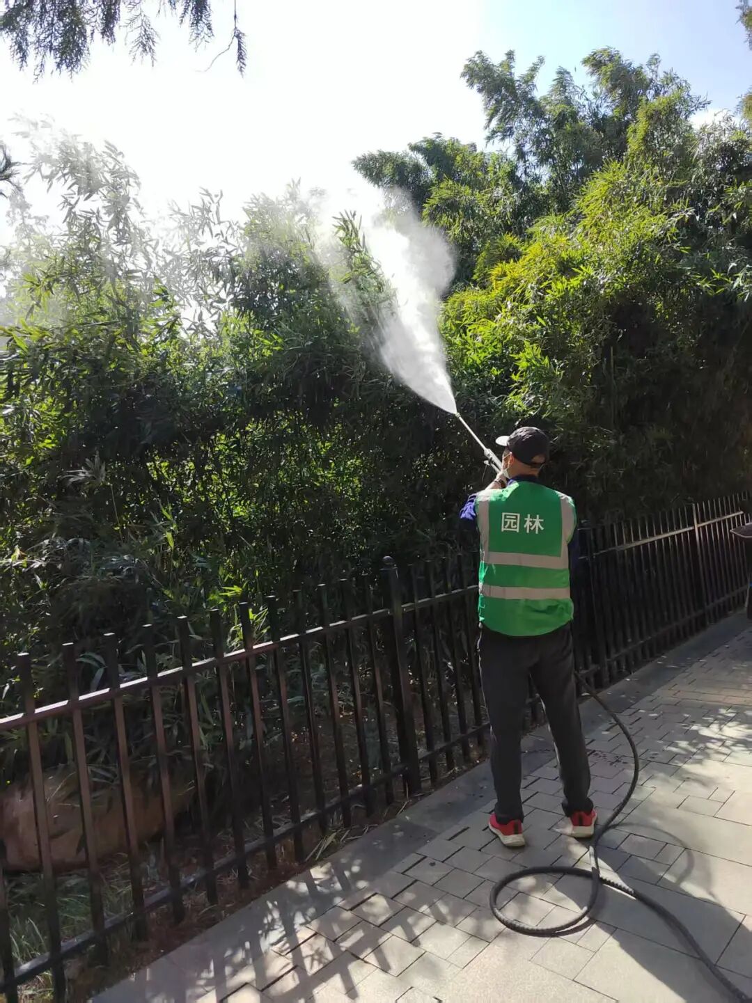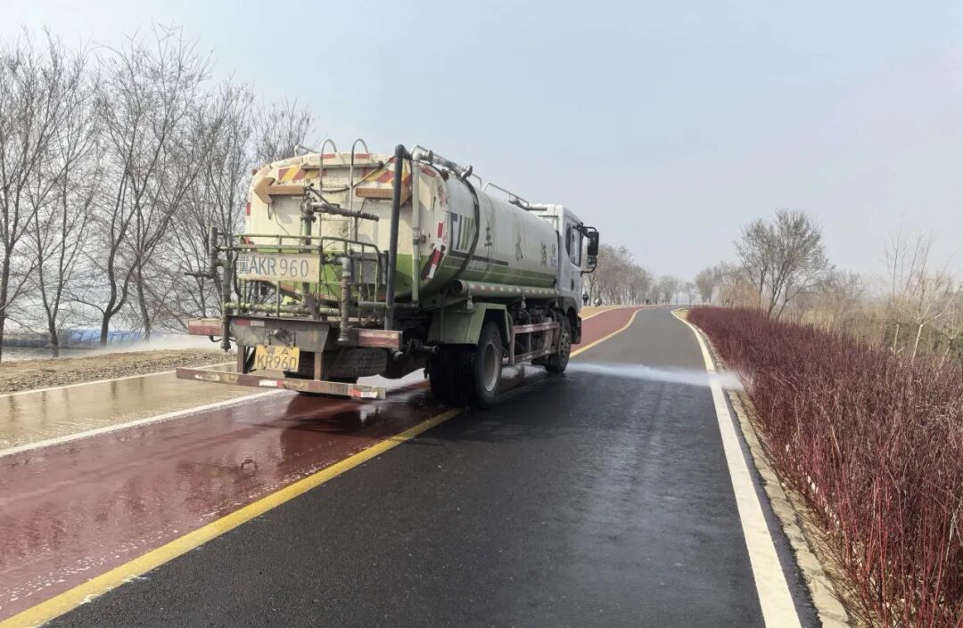 二是科学开展抑尘。充分利用现有喷灌设施,在做好春季植物“返青水”浇灌工作的基础上,通过延长浇灌时间、增加喷灌频次等方式,持续为绿地增湿,有效抑制地表扬尘;针对喷灌覆盖盲区,采取“机械+人工”相结合的方式,加大冲洗和保洁力度。对公园主干道、广场铺装区域、绿地周边道路等重点区域,安排洒水车、洗地车等进行专项冲洗;组织管护人员对绿化带缝隙等卫生死角进行清扫,确保降尘工作无盲区。