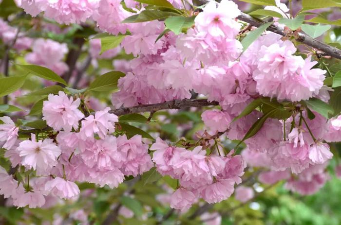 在园内大草坪东侧,1500余株晚樱竞相绽放,包括关山樱、普贤象樱、松月樱等多个品种,花瓣层层叠叠、紧凑饱满,花朵硕大丰盈,微风拂过,淡淡花香萦绕鼻尖。