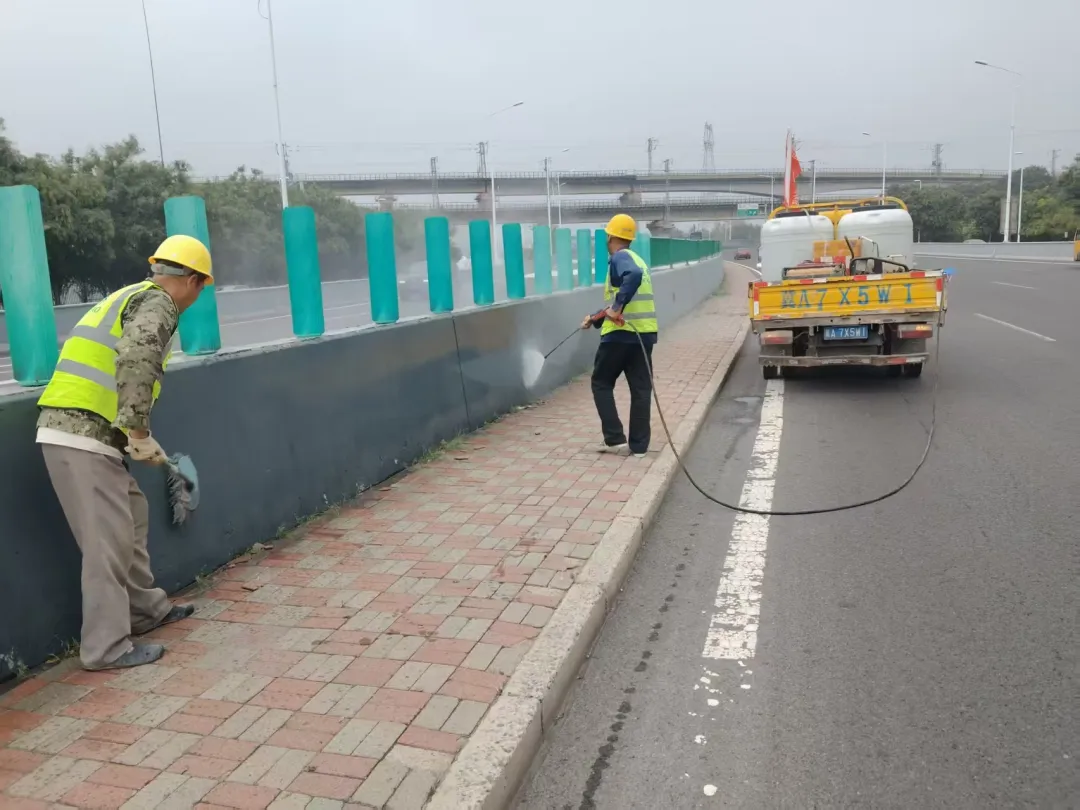 此次作业区域包括和平路沿线、南二环西延、胜利大街、中华大街、槐安路沿线高架桥、新城大街等多条城市交通主动脉及火车站广场周边匝道,重点对高架桥两侧声屏障及防撞挡墙的顽固污渍和卫生死角进行深度冲洗作业,确保实现无死角、全覆盖的清洁效果。