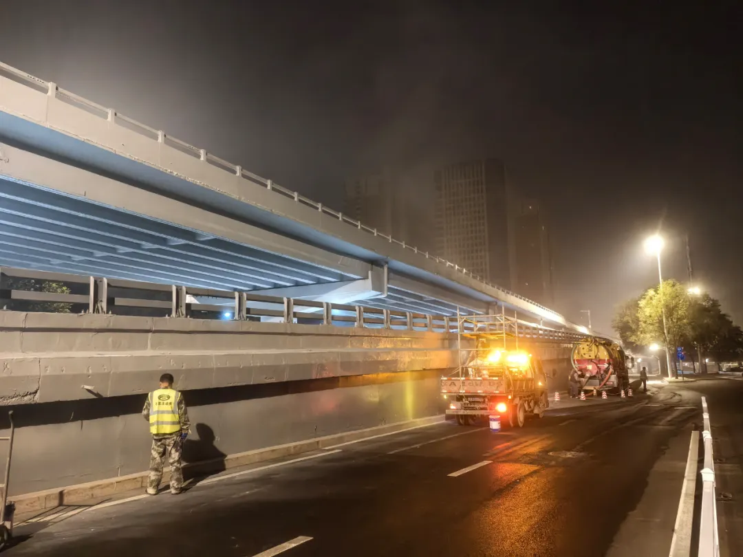 此次改造聚焦桥梁外观与结构维护:一是全面粉刷桥梁挡墙内外侧,累计覆盖面积9000余平方米;二是采用定制防护板,修复混凝土开裂、钢筋外露等结构损伤,延长桥梁使用寿命。此外,在墩柱规范设置防护警示标志,强化通行安全。