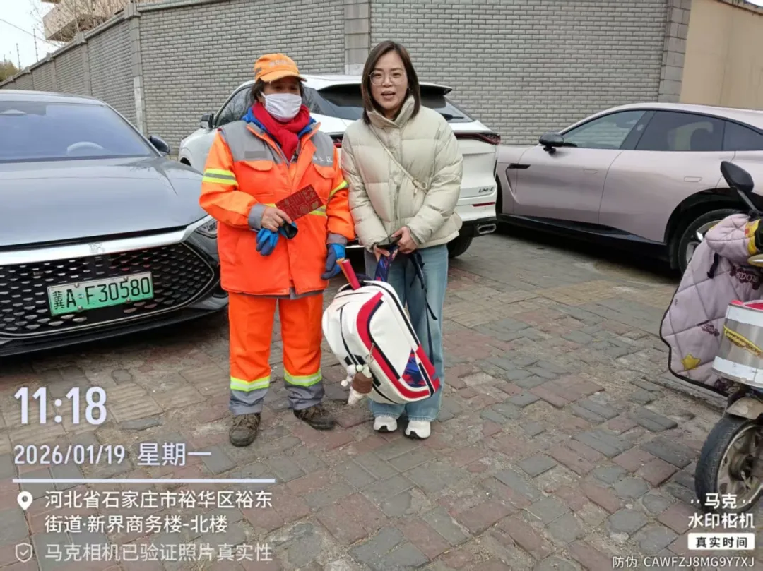 1月19日凌晨,裕华环卫工人霍吉兰保洁作业时,在翟营大街槐安路附近捡到一个白色背包,里面装有重要证件。霍吉兰立即联系班组负责人说明情况并耐心保管。经过一番等待,失主来寻,确认无误后物归原主。失主对环卫工人认真负责、拾金不昧的精神表示高度赞扬。