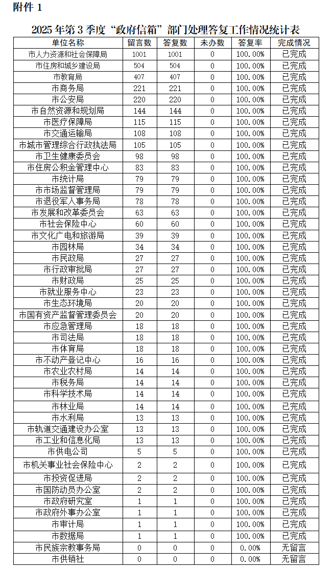 附件1:2025年第3季度“政府信箱”部门处理答复工作情况统计表