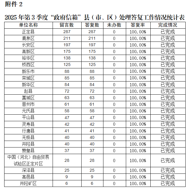 附件2:2025年第3季度“政府信箱”县(市、区)处理答复工作情况统计表