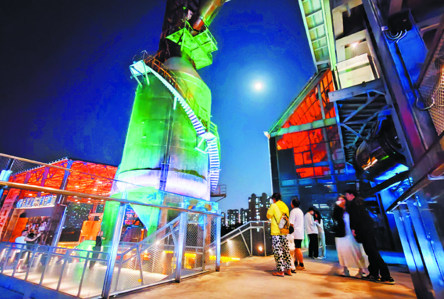 石家庄工业遗址公园灯光璀璨、人头攒动,市民来到这里游玩打卡,品尝美食,享受假日的美好时光。