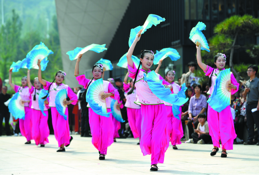 在光禄山风景区的团结之花广场上,鼓点碰撞,锣鼓喧天,红绸如火焰腾窜,彩扇似旋风翻飞。秧歌队员们身穿喜庆艳丽的服装、头戴五彩头饰,充满激情地跳着传统秧歌舞步,把秧歌的欢快、热情展现得淋漓尽致。