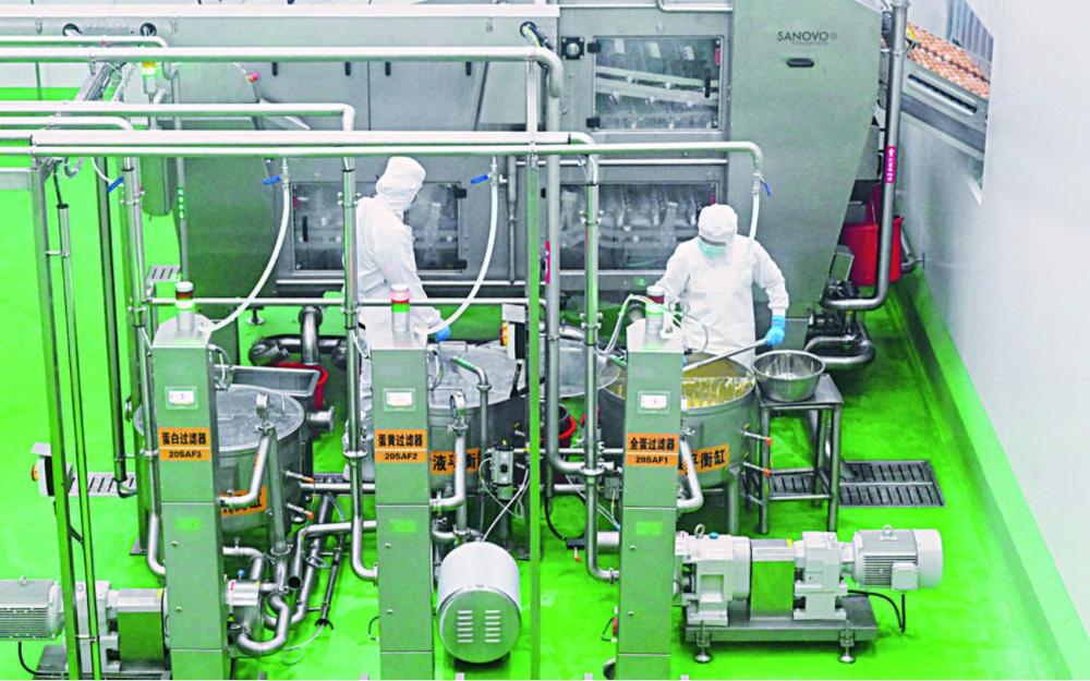 在石家庄市现代食品产业园大山食品蛋液深加工项目车间,技术人员正在操作相关智能设备进行蛋液生产。