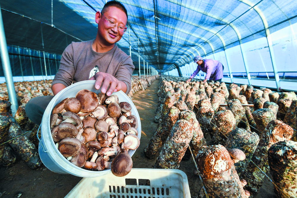 2月27日,在石家庄市晋州市丰业种植专业合作社梨木香菇的种植大棚里,密密麻麻的菌棒上结满了伞状香菇。大棚外,工人正将采摘下的香菇装车,准备发往北京。