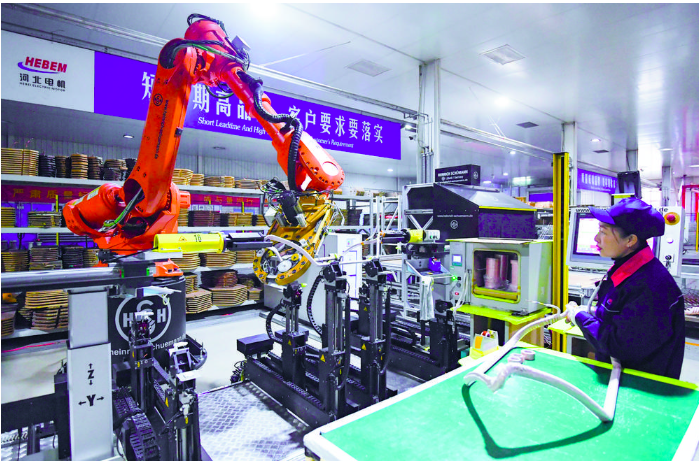 在河北电机股份有限公司的智能化装配车间,机械臂进行产品组装作业。