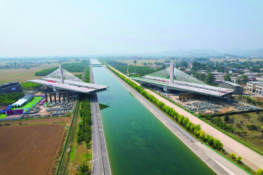 双侧转体,跨水架桥“零污染”。衡昔高速跨南水北调特大桥,是我国首座跨越南水北调中线干渠波形钢腹板矮塔斜拉转体桥。该桥全长1277米,转体部分总重超7万吨,创下国内同类桥梁转体重量新纪录。创新采用波形钢腹板结构实现桥梁轻量化设计,引进“智能转体系统”,运用双侧水平对转施工工艺,实现转体全过程自动化监测与精准控制,施工全过程对干渠水质零污染,为同类跨水利工程施工提供了宝贵的经验。