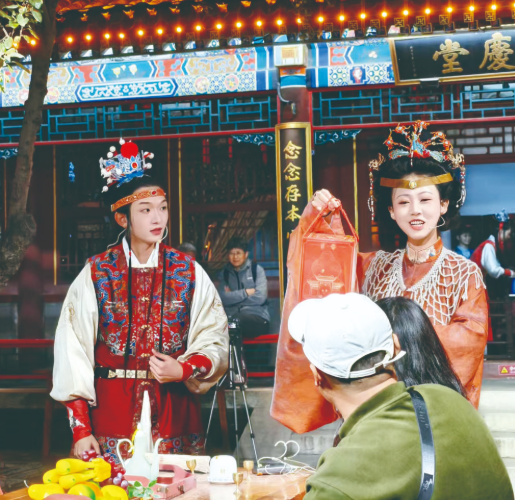 荣禧堂前,“王熙凤”与“林黛玉”邀众人玩起“玉”字飞花令,北京游客刘颖欣身着汉服连答四句,最后一句“凤姐姐谬赞了”更是引得全场欢笑。50分钟内,6个互动节目相继上演,每晚三场全年无休的演出,让景区游客接待量同比翻番。“本想单纯拍照打卡,没想到彻底入了戏,这才是真正的国风体验。”刘颖欣感慨道。
