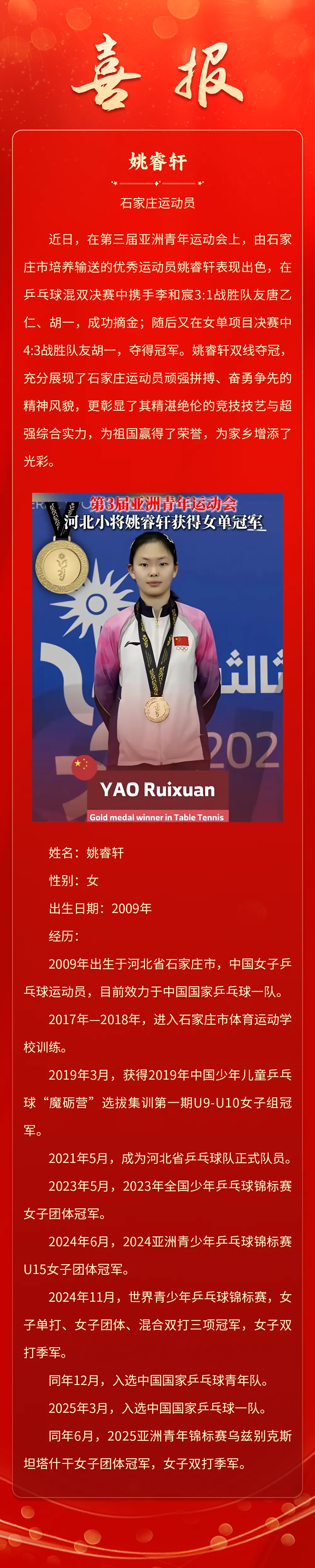 喜报 | 闪耀亚青会!石家庄小将姚睿轩包揽乒乓球女单、混双冠军,加冕“双冠王”!