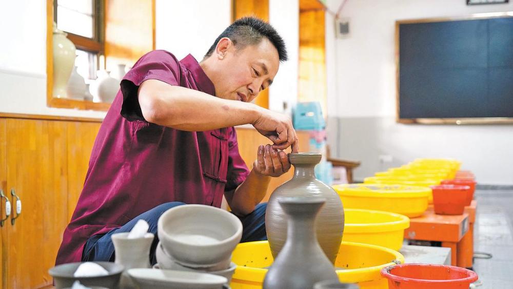 Du molds porcelain jars at the Jingxing Kiln Cultural Research Association Study Base in Jingxing. [Photo provided to China Daily]