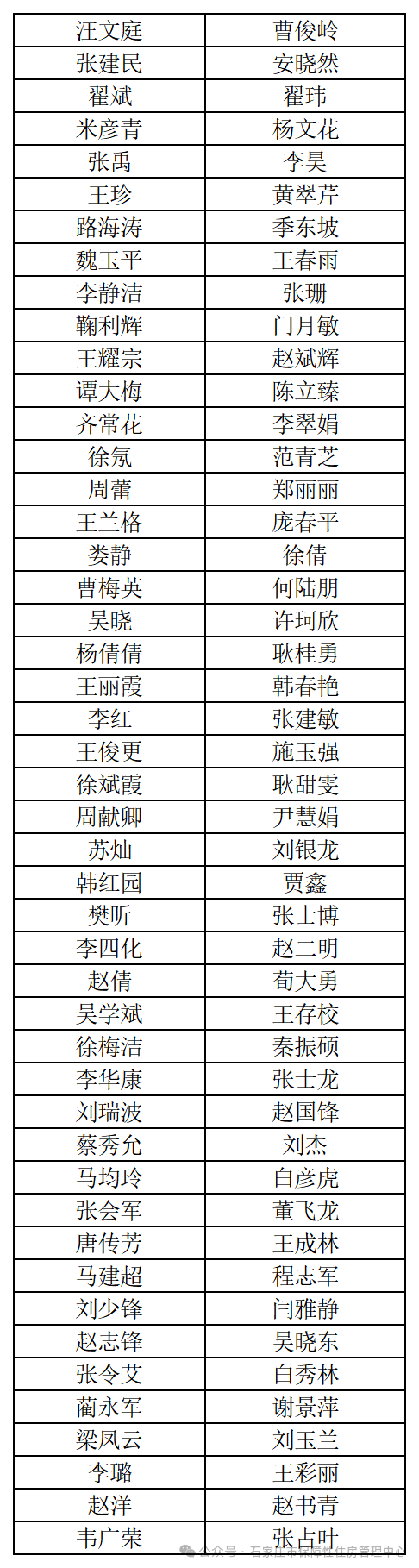 石家庄市区2025年9月份换房审核工作已经结束,请本月审核通过的家庭(见附件),关注申请人手机短信通知,按照通知要求打印《公共租赁住房换房通知书》,在规定的时间内到小区管理单位办理换房入住手续。