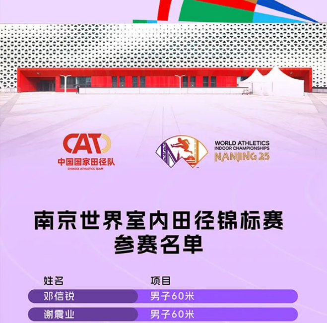 2025南京世界田联室内锦标赛将于3月21日-23日在南京市体育训练中心室内田径馆举行。近日,中国田径协会公布了中国队参赛名单,其中包括来自石家庄的女子铅球奥运冠军巩立姣、男子短跑名将谢震业等知名运动员。